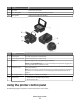 Use the: 9 To Select button • Select menu options. • Save settings. • Feed or eject paper. Press and hold for 3 seconds to feed or eject paper from the printer. 10 Arrow buttons • Choose a menu or submenu item that appears on the display. 11 Back button 12 Setup button • Return to the previous screen. • Exit from one menu level to a higher one. Access the setup menu and change printer settings. Note: The Copy, Scan, Fax, and Photo button lights are off when this button is selected.