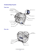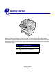 1 Getting started The Lexmark X215™ MFP is a multifunction printer. You can use it to copy, fax, print, and scan. Before unpacking your machine, select a level, stable surface on which to set it. Allow adequate space for air circulation and opening covers and trays. The area should be well-ventilated and away from direct sunlight or sources of heat, cold, and humidity. Do not set the machine close to the edge of your desk or table. Clearance space Front 482.6 mm (19 in.