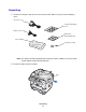 Unpacking 1 Remove the machine and all accessories from the box. Make sure you have the following items: AC power cord Lexmark X215 Setup sheet Telephone line cord Drivers and Documentation CD Toner cartridge Language overlays Note: The Drivers and Documentation CD contains the driver software, the User’s Guide and the Adobe Acrobat Reader program. 2 Remove all tape from the machine.