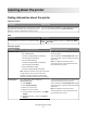 Learning about the printer Finding information about the printer Setup information Description Where to find The Setup information gives you instructions for setting You can find the Setup information on the inside of the printer up the printer. Follow the set of instructions for local, box or on the Lexmark Web site at www.lexmark.com. network, or wireless, depending on what you need. Help Description Where to find The Help gives you instructions for using the software.