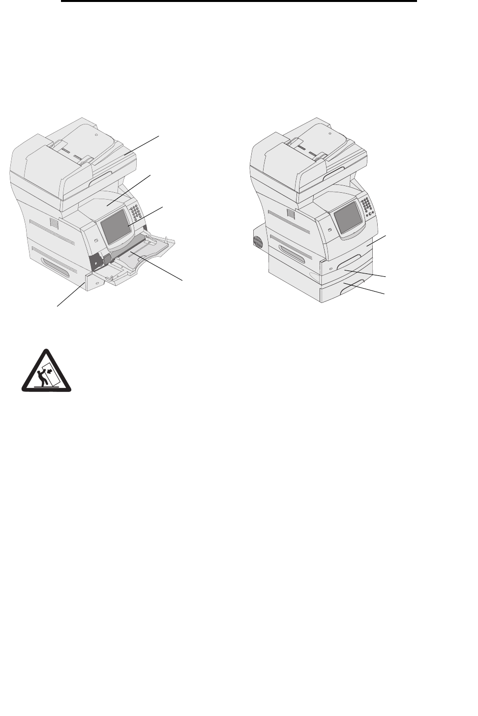 The following illustrations show a standard MFP and an MFP with a duplex unit and a 500-sheet drawer. Other print media
