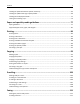 Contents 2 Contents Safety information.......................................................................................7 Learning about the printer...........................................................................9 Finding information about the printer......................................................................................................9 Selecting a location for the printer.......................................................................................................