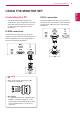 USING THE MONITOR SET 9 USING THE MONITOR SET Your Monitor set supports Plug & Play*. yy *Plug & Play: A PC recognizes a connected device that users connect to a PC and turn on, without device configuration or user intervention. D-SUB connection Transmits analog video from your PC to the Monitor set. Connect the PC and the Monitor set with the supplied D-sub 15 pin signal cable as shown in the following illustrations.