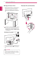 MONTAGE UND VORBEREITUNG Montage auf einem Tisch Benutzen Sie den Kabelhalter DEUTSCH DEU 1 Heben Sie den Monitor an, und kippen Sie ihn auf einem Tisch in die aufrechte Position. Lassen Sie (mindestens) 10 cm Platz zur Wand, um eine gute Belüftung zu gewährleisten. 10 cm 10 cm 10 cm 10 cm Kabelhalter 2 1 Schließen Sie das Netzkabel an den Monitor an, dann stecken Sie das Netzkabel in die Steckdose ein. ( Vor dem Anschließen, bitte überprüfen Sie, dass der “ON/OFF” Knopf in “O” Position ist.
