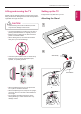 ASSEMBLING AND PREPARING Please note the following advice to prevent the TV from being scratched or damaged and for safe transportation regardless of its type and size. CAUTION yy Avoid touching the screen at all times, as this may result in damage to the screen. Setting up the TV ENGLISH ENG Lifting and moving the TV Image shown may differ from your TV. Attaching the Stand 1 yy It is recommended to move the TV in the box or packing material that the TV originally came in.