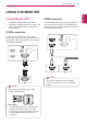 USING THE MONITOR Headphone port connection To use the touch screen, connect the USB port to the PC. Use a USB 2.0 cable with A-B type to connect your PC. (The USB port on the monitor is only for the touch screen feature.) Use the headphone port to connect a peripheral device to the monitor. Connect as illustrated. D-SUB OUT (sold separately) UP H/P USB UP HDMI 2 HDMI 1 D-SUB IN H/P USB UP HDMI 2 HDMI 1 D-SUB IN NOTE Peripheral devices are sold separately.