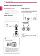USING THE MONITOR SET USING THE MONITOR SET ENGLISH ENG Connecting to a PC Your Monitor set supports Plug & Play*. yy *Plug & Play: A PC recognizes a connected device that users connect to a PC and turn on, without device configuration or user intervention. HDMI connection Transmits the digital video and audio signals from your PC or A/V to the Monitor set. Connect the PC or A/V and the Monitor set with the HDMI cable as shown in the following illustrations.