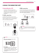 USING THE MONITOR SET 9 USING THE MONITOR SET Your Monitor set supports Plug & Play*. yy *Plug & Play: A PC recognizes a connected device that users connect to a PC and turn on, without device configuration or user intervention. HDMI connection Transmits the digital video and audio signals from your PC or A/V to the Monitor set. Connect the PC or A/V and the Monitor set with the HDMI cable as shown in the following illustrations. D-SUB connection Transmits analog video from your PC to the Monitor set.