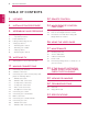 TABLE OF CONTENTS TABLE OF CONTENTS ENGLISH 3 LICENSES 32 REMOTE CONTROL 4 INSTALLATION PROCEDURE 34 MAGIC REMOTE CONTROL FUNCTIONS 5 ASSEMBLING AND PREPARING 5 7 9 10 11 11 12 13 14 Unpacking - Separate purchase Parts and buttons Lifting and moving the TV Setting up the TV - Attaching the Stand - Mounting on a table - Tidying cables - Detaching the Stand 35 35 35 Registering Magic Remote Control How to use Magic Remote Control Precautions to Take when Using the Magic Remote Control 36 U