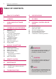 TABLE OF CONTENTS ENGLISH ENG TABLE OF CONTENTS 2 TABLE OF CONTENTS 47 SPECIFICATIONS 3 LICENSES 56 IR CODES 3 OPEN SOURCE SOFTWARE NOTICE 57 EXTERNAL CONTROL DEVICE SETUP 4 ASSEMBLING AND PREPARING 57 57 4 7 8 9 10 11 11 14 17 19 20 Unpacking Separate Purchase Parts and Button - Using the Joystick button Lifting and Moving the TV Setting up the TV - Attaching the stand Mounting on a table Mounting on a wall How to use Dual Lock™ Tidying cables RS-232C Setup Type of Connector: D-Sub 9