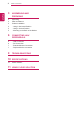 ASSEMBLING AND PREPARING 3 ASSEMBLING AND PREPARING ENG English Unpacking Please check whether all the components are included in the box before using the product. If there are missing components, contact the retail store where you purchased the product. Note that the product and components may look different from those shown here. Owner's Manual/Card Main Unit Power Cord AC/DC Adapter Stand Base Four Screws Mount Bracket CAUTION Only use an approved LG power adapter.