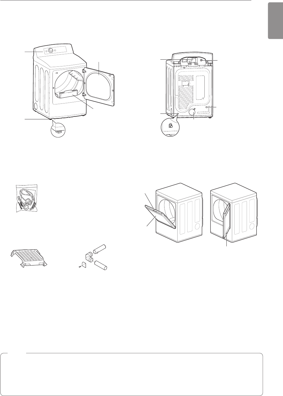 PRODUCT OVERVIEW 11 ENGLISH PRODUCT OVERVIEW Parts Control panel Reversible door Lint filter Leveling feet Accessories Terminal block access panel (electric models) Gas connection location (gas models) Power cord location (gas models) Water inlet valve (on some models) Exhaust duct outlet Two-Way Reversible Door (on some models) Included Accessories Release Safety Tether Kit (on some models) Hamper door Optional Accessories Swing door Drying rack (sold separately) No.