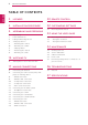 TABLE OF CONTENTS Table of Contents ENGLISH 3 LICENSES 30 REMOTE CONTROL 4 Installation procedure 32 CUSTOMIZING SETTINGS 32 Accessing main menus 5 ASSEMBLING AND PREPARING 5 7 8 9 9 10 11 12 13 Unpacking Parts and buttons Lifting and moving the TV Setting up the TV - Attaching the Stand - Mounting on a table - Tidying cables - Detaching the Stand - Mounting on a wall 15 WATCHING TV 15 Turning the TV on for the first time 17 17 18 18 19 20 21 22 23 23 24 24 25 26 27 28 29 33 USING THE