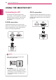 USING THE MONITOR SET USING THE MONITOR SET ENGLISH ENG Connecting to a PC Your Monitor set supports Plug & Play*. yy *Plug & Play: A PC recognizes a connected device that users connect to a PC and turn on, without device configuration or user intervention. D-SUB connection Transmits analog video from your PC to the Monitor set. Connect the PC and the Monitor set with the supplied D-sub 15 pin signal cable as shown in the following illustrations.