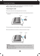 Connecting the Display Disassembling the stand 1. Put a cushion or soft cloth on aflat 2. Place the monitor face Down on surface. the cushion or soft cloth. Stand Base Part Head Part 4. Pushing Latch inside, Take the 3. Hold the Head Part with one hand and hold the Stand Base Part with the other as shown in the picture and pull the Stand Base Part lightly upward stand base from stand body. 5. Please pull the stand body lightly to separate it from the hinge body.