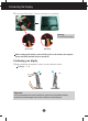 Connecting the Display Disassembling the stand 1. Put a cushion or soft cloth on aflat 2. Place the monitor face Down on surface. 3. the cushion or soft cloth. Change your lock on the product as it follows and turn it in the arrow direction. If you can't release the stand base even the locking knob is at a release position, Please push the indicated knob down and retry it. 4. Pull out the Stand to remove.