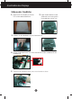 Anschließen des Displays Abbauen des Standfußes 1. Legen Sie ein Kissen oder ein weiches 2. Legen Sie den Monitor mit der Tuch auf eine ebene Oberfläche. Vorderseite nach unten auf das Kissen oder das weiche Tuch. 3. Schieben Sie die Kabelabdeckung vom Monitorfuß ab. 4. Drücken Sie die Sperrlasche nach innen und nehmen Sie den Ständersockel vom Ständerteil ab. 5. Ziehen Sie das Ständerteil leicht, um es vom Scharnier zu lösen.