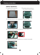 Displeja pievieno‰ana Stat¥va izjauk‰ana 1. Uz plakanas virsmas novietojiet 2. Novietojiet monitoru ar ekrÇnu uz spilvenu vai m¥kstu drÇnu. leju uz spilvena vai m¥kstas drÇnas. 3. Virziet kabe∫a dekorat¥vo vÇci¿u virzienÇ prom no savienojo‰Çs da∫as. 4. Stumjot Ç˙i uz iek‰pusi, no¿emiet stat¥va pamatni no stat¥va korpusa. 5. Viegli pavelciet pamatnes savienojo‰o da∫u, lai atvienotu to no e¿Æïm.