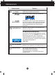 Auswählen und Einstellen von Funktionen der Bildschirmanzeige (OSD) Hauptmenü Untermenü Beschreibung BILDLAGE HORIZONTAL Verschieben des Bildes nach links bzw. rechts. VERTIKAL Verschieben des Bildes nach oben bzw. unten. MENU : Beenden - : Verkleinern + -: Vergrößern SET : Anderes Untermenü auswählen GLEICHLAUF TAKT Verringern vertikaler Balken oder Streifen, die im Hintergrund des Bildschirms sichtbar sind. Die horizontale Bildschirmgröße ändert sich ebenfalls.