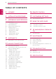 TABLE OF CONTENTS Table of Contents ENGLISH 3 LICENSES 36 REMOTE CONTROL 4 Installation procedure 39 CUSTOMIZING SETTINGS 39 Accessing main menus 5 ASSEMBLING AND PREPARING 5 8 9 10 11 11 15 16 17 19 Unpacking - Separate purchase Parts and buttons Lifting and moving the TV Setting up the TV - Attaching the Stand - Mounting on a table - Tidying cables - Detaching the Stand - Mounting on a wall 21 WATCHING TV 21 Turning the TV on for the first time 23 MAKING CONNECTIONS 23 24 Connecti