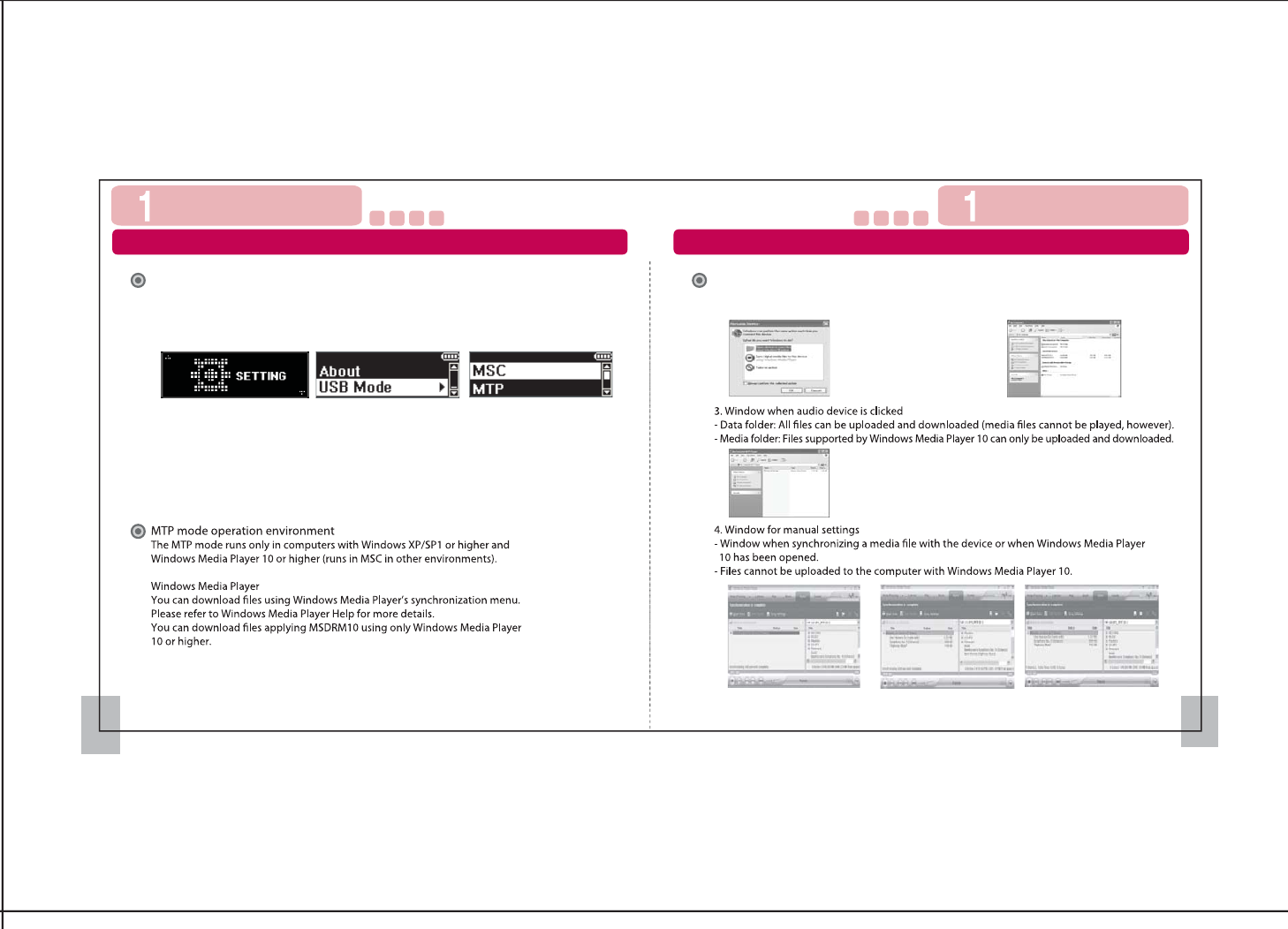 1. In Setting-> USB Mode, shift to MTP mode. (Refer to the Settings section.)