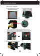 Anschließen des Displays Abbauen des Standfußes 1. Legen Sie ein Kissen oder ein weiches 2. Legen Sie den Monitor mit der Tuch auf eine ebene Oberfläche. Vorderseite nach unten auf das Kissen oder das weiche Tuch. 3. Drehen Sie die Verriegelung in Pfeilrichtung in die abgebildete Stellung. Lässt sich der Ständersockel auch dann nicht abnehmen, wenn der Verriegelungsknopf in der Freigabestellung steht, drücken Sie die in der Abbildung gezeigte Lasche nach unten und versuchen Sie es erneut. 4.