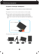 Monitoriaus prijungimas Prie‰ pastatant monitori˜, ∞sitikinkite, kad aparato, kompiuterio sistemos ir papildomos aparatros maitinimai yra i‰jungti. Kaip uÏdòti arba nuimti stovo pagrindà 1. Monitori˜ padòkite ekranu Ïemyn ant pagalvòlòs arba mink‰to skuduròlio. 2. Stovo pagrindà pritvirtinkite prie stovo korpuso.