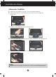 Anschließen des Displays Abbauen des Standfußes 1. Legen Sie ein Kissen oder ein weiches Tuch auf eine ebene Oberfläche. 2. Legen Sie den Monitor mit der Vorderseite nach unten auf das Kissen oder das weiche Tuch. 3. Schieben Sie die Kabelabdeckung vom Monitorfuß ab. 4. Drücken Sie auf die Sperrlasche und nehmen Sie den Ständersockel vom Ständerteil ab. 5. Ziehen Sie das Ständerteil leicht, um es vom Scharnier zu lösen.