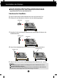 Anschließen des Displays Abbauen des Standfußes 1. Legen Sie den Monitor mit der Vorderseite nach unten auf das Kissen oder das weiche Tuch. 2. Schieben Sie die Kabelabdeckung vom Monitorfuß ab. 3. Drücken Sie auf den Haken und nehmen Sie den Standfußsockel von der Standfußverbindung ab. Haken 4. Ziehen Sie das Ständerteil leicht, um es vom Scharnier zu lösen.