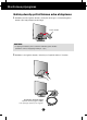 Monitoriaus prijungimas Prie‰ pastatant monitori˜, ∞sitikinkite, kad aparato, kompiuterio sistemos ir papildomos aparatros maitinimai yra i‰jungti. Monitoriaus stovo pritvirtinimas 1. Monitori˜ padòkite ekranu Ïemyn ant pagalvòlòs arba mink‰to skuduròlio. 2. Pritvirtinkite stovo pagrindà prie stovo tinkama kryptimi, kaip parodyta paveikslòlyje. Stovo korpusà Stovo Pagrindas 3. Pritvirtinkite prie stovo pagrindo monitori˜, sukdami varÏtà ∞ de‰in´ pus´. VarÏtas : VarÏtà sukite varÏto rankenòle. 4.