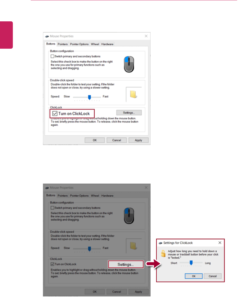 4 When [Mouse Properties] screen appears, select [Turn on ClickLock].
