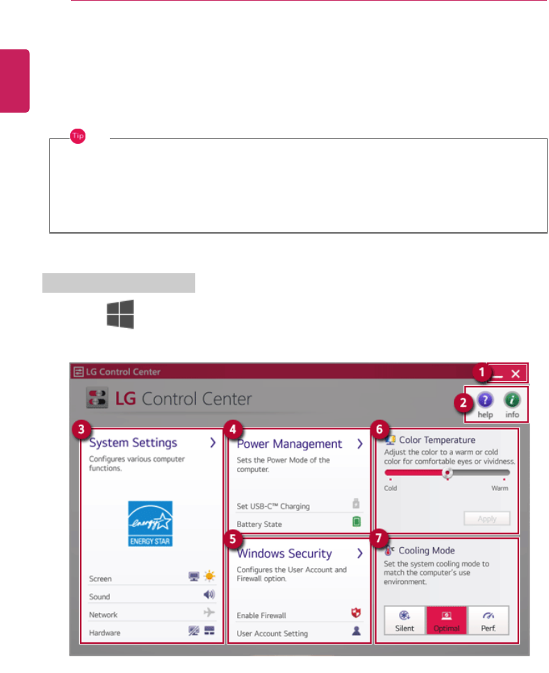 LG Control Center allows you to easily change the settings of your PC according to your needs.