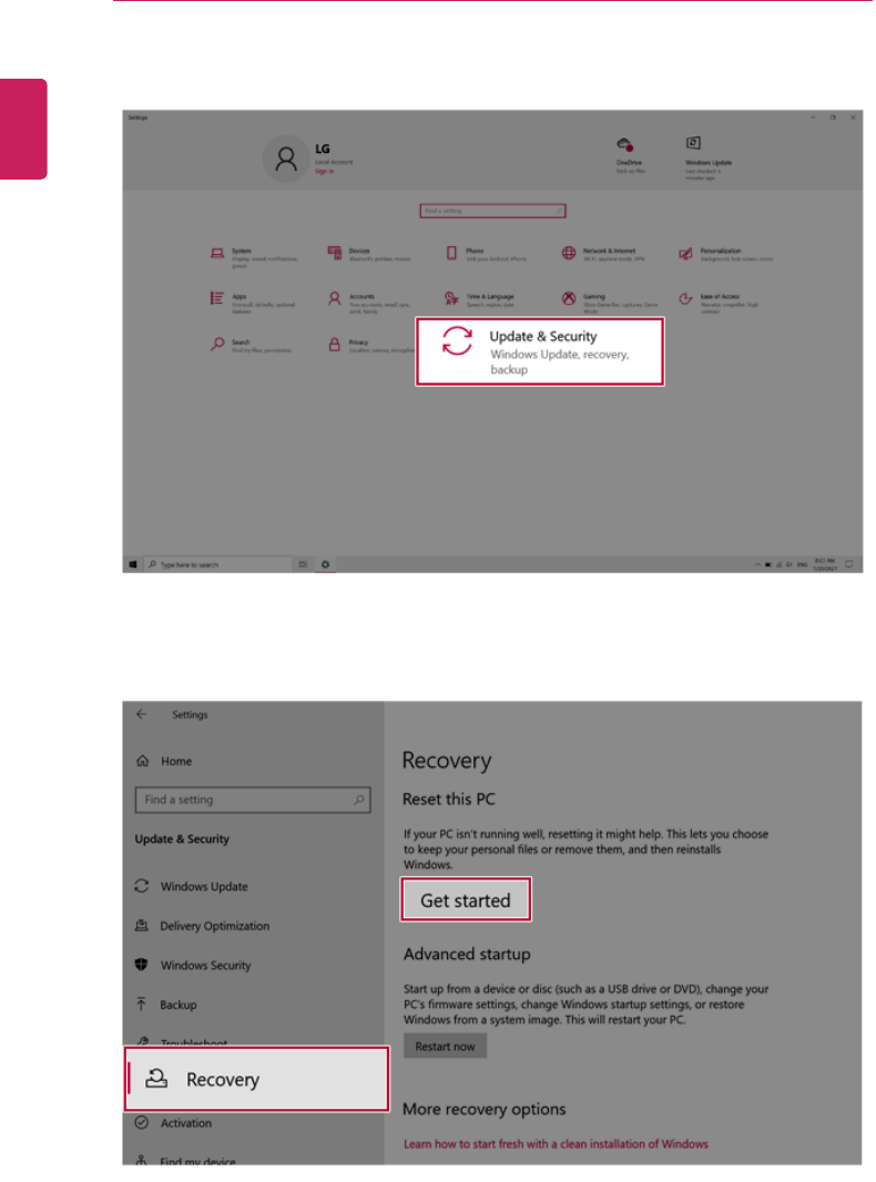 3 Select the [Recovery] menu and press [Get started] in the Reset this PC menu.