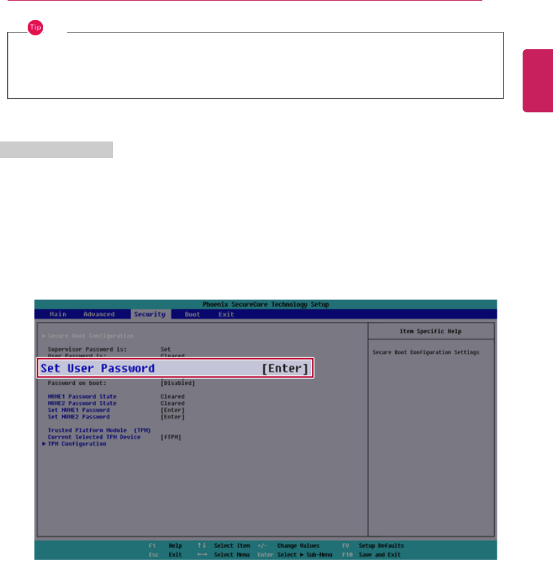 2 When the Security item appears, press the [Enter] button in the [Set User Password] menu.