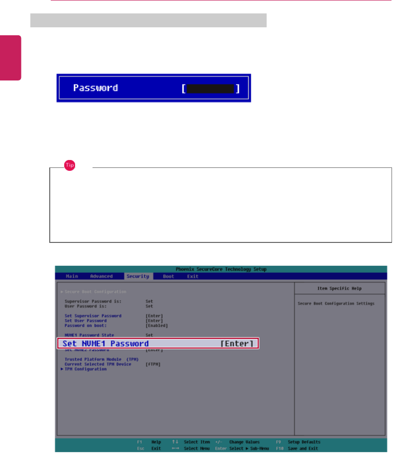 Depending on the model, the menu name may be displayed as NVMe™ Password, SSD