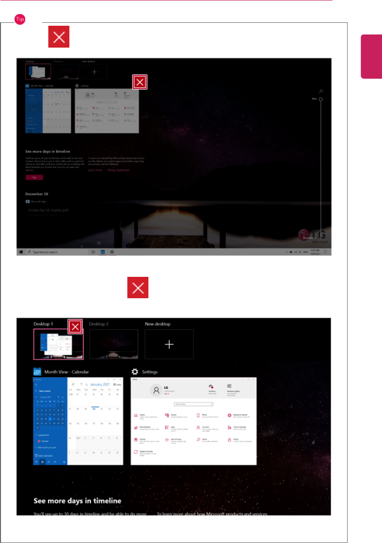 In the desktop preview, press the [ ] button to delete the desktop and move running apps