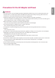 WARNING •• Use only the power cord or AC adapter provided or approved by LG Electronics, Inc. If you use another power cord, make sure that it is certified by the national standards. If the power cable is faulty in any way, please contact the manufacturer or the nearest authorized service center for a replacement. •• Operate the display only from a power source(i.e. voltage) indicated in the product specification. -- Otherwise the product can be damaged, fire can occur or you may be electrocuted.