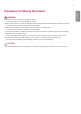 ENGLISH Precautions for Installing the Product WARNING •• Contact the service center before installing the product. -- It can cause electric shock and damage the product. •• Do not drop an object on or impact on the product. Keep out of reach of children and do not place toys or objects near the product to prevent throwing things on the product screen. -- It can cause injury to human, problem to product and damage the display. •• Do not put heavy objects on, or hang from, the product.
