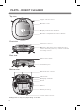 PARTS - ROBOT CLEANER Top view Upper camera sensor Dust bin cover Display and function buttons Dust bin compartment release button Front view Ultrasonic sensors Obstacle detecting sensor window, home station detecting sensors, remote controller receiving sensors. Rear view Main Power switch Ventilation port Bottom view Cliff detection sensors Side brush Charging terminals Brush Wheel Battery housing Lower camera sensor s Appearance may vary depending on model.