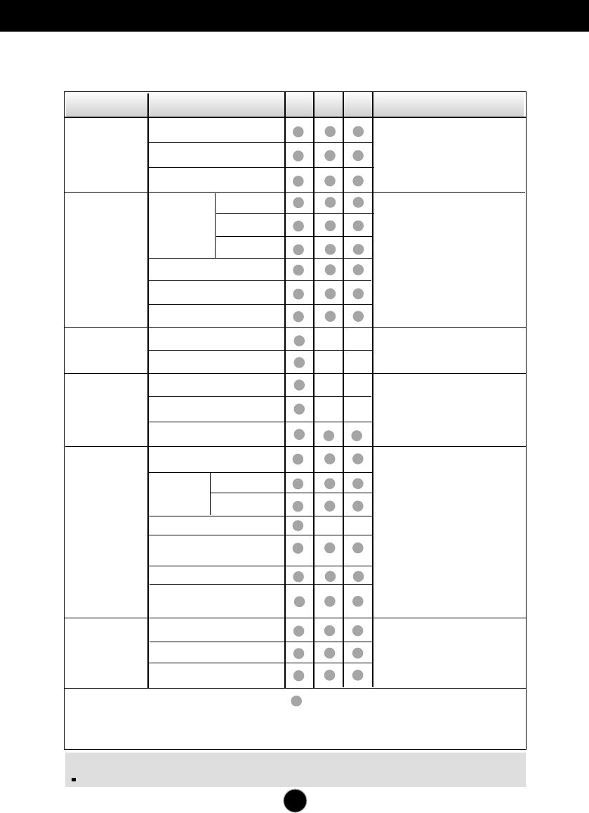 Følgende tabell inneholder alle menyene for kontroll, justering og innstilling
