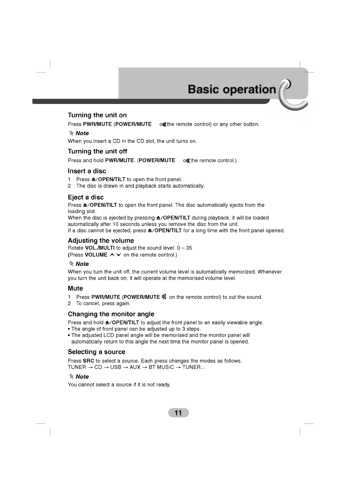 TUNER→CD→USB→AUX→BTMUSIC→TUNER...