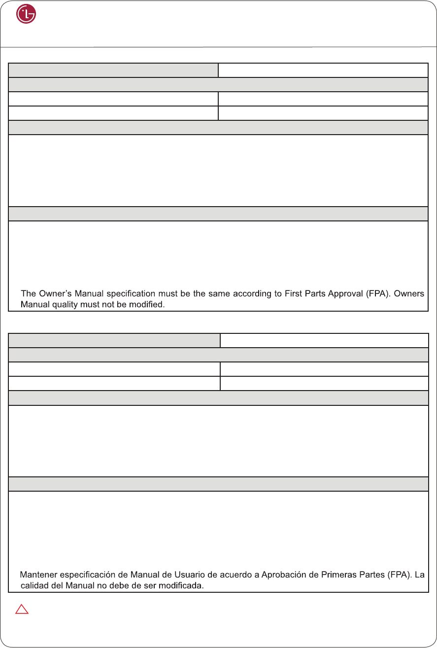 LG Electronics Monterrey, México S.A. de C.V. PART NUMBER: MFL67851401 DATE: AUG 17th, 2013 DESCRIPTION: OWNER’S MANUAL Part No. MFL67851401 MODEL DESCRIPTION: Product: Bottom Freezer Refrigerator Project: QUANTUM-B DRAWER/SWING Brand: LG Customer: LGEUS PRINTING SPECIFICATION: 1. Trim Size (mm): 182±1 (W), 257±1 (H) 4. Printing Method: Off Set 2. Printing Color: Black 5. Bindery Type: Saddle Stitch 3. Paper Type: 6. Language: English - Cover: Bond 63 gr 7.