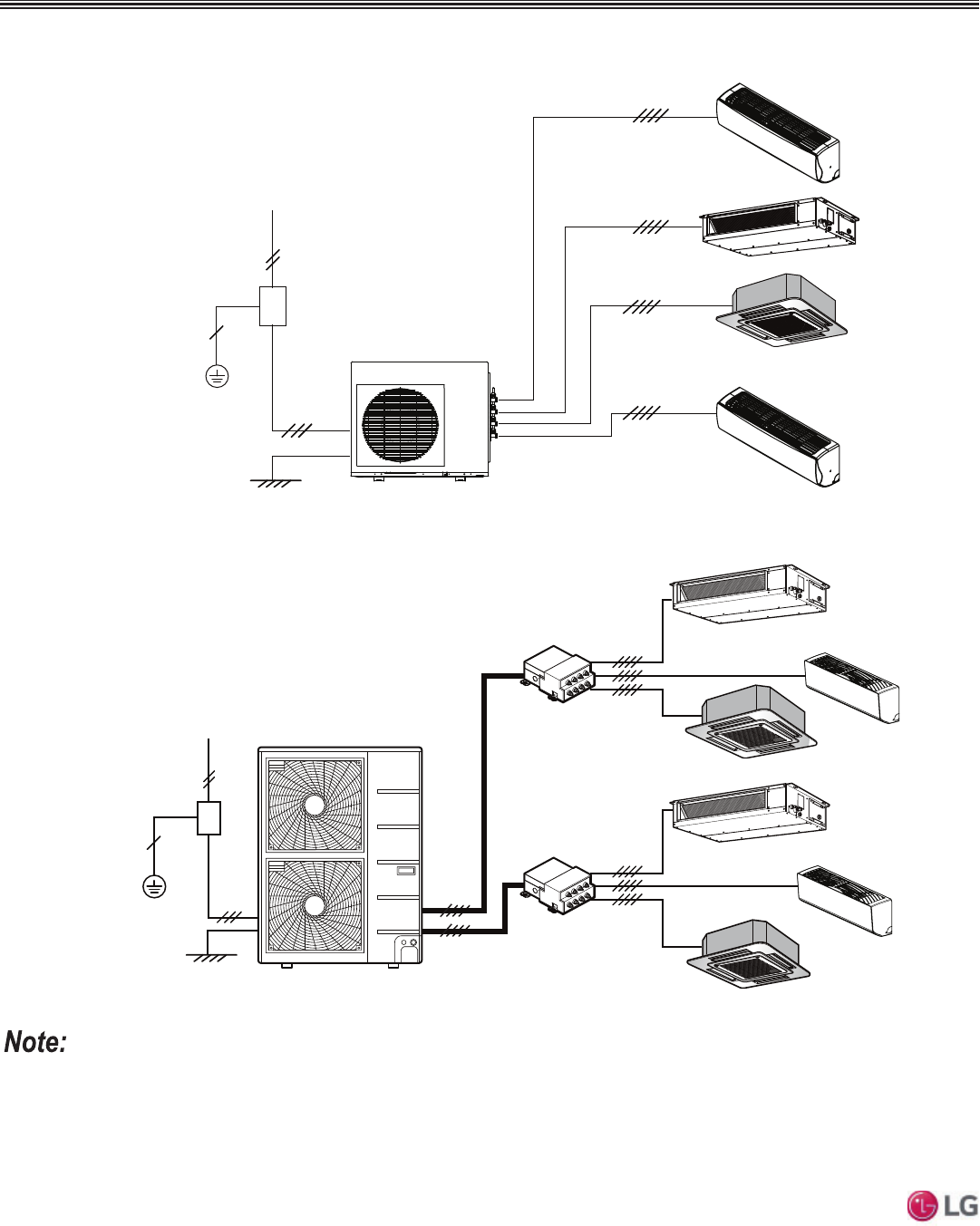 • 0DNHVXUHWKHFRPPXQLFDWLRQVFDEOHSRZHUZLULQJIURPWKHRXWGRRUXQLWVWRWKHLQGRRUEUDQFKGLVWULEXWLRQXQLWVDQGWKHSRZHUZLULQJWR