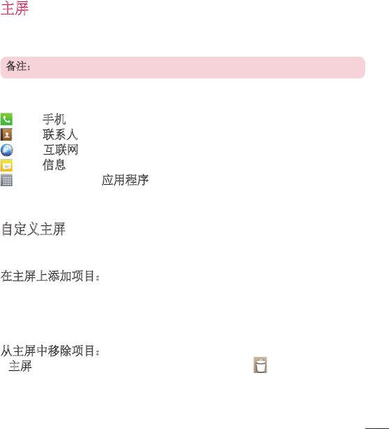 • 主屏 > 点触并按住要移除的图标 > 将其拖到 。