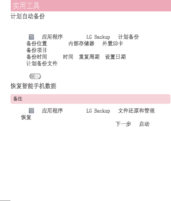 1 点触 > 应用程序选项卡 > LG Backup > 计划备份。
