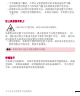 • 只能使用 LG 电池和充电器。 LG 充电器设计为最大限度地延长电 池的使用寿命。 • 请勿拆解电池或将其短路。 • 保持电池的金属触点清洁。 • 当电池不再提供合乎要求的性能时,请更换电池。 在需要更换之 前,电池组可以反复充电数百次。 • 如果很长一段时间都没用过电池,请将电池再次进行充电以保持最 佳使用状态。 • 请勿将电池充电器暴露在直射阳光下,也不要在诸如浴室之类的高 湿环境中使用。 • 请勿将电池存放在过热或过冷的地方,这可能损害电池的性能。 • 如果用不适当的电池进行替换,可能会有爆炸危险。 • 请按制造商的说明处置用过的电池。 如果可能,请循环使用电 池。 请勿像处理家用废物一样处理电池。 • 如果要更换电池,请将其携带至 LG Electronics 授权服务点或经 销商处以寻求帮助。 • 手机充好电后,请务必将充电器从墙上插座拔下,以避免不必要 的耗电。 • 实际的电池寿命将取决于网络配置、产品设置、使用方式、电池和 环境条件。 • 确保没有细尖的物体(比如动物牙齿或指甲)进入产品内触碰电 池。 这可能引发火灾。 开源软件提示信息 为取得本产品内搭载的 GPL、LGP
