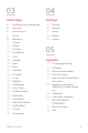03 04 Useful Apps Settings 84 85 86 87 90 91 113 117 119 121 122 123 124 125 125 127 128 128 129 129 129 130 131 131 131 132 135 135 147 148 150 Installing and uninstalling apps App trash App Shortcuts Phone Messaging Camera Gallery Contacts QuickMemo+ Clock Calendar Tasks Music Calculator LG Health E-mail FM Radio File Manager Smart Doctor LG Mobile Switch Downloads SmartWorld RemoteCall Service Cell Broadcast Chrome Google apps Table of contents Settings Network Sound Display General 05 Appendix