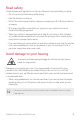 Road safety Check the laws and regulations on the use of devices in the area when you drive. • Do not use a hand-held device while driving. • Give full attention to driving. • Pull off the road and park before making or answering a call if driving conditions so require. • RF energy may affect some electronic systems in your vehicle such as car stereos and safety equipment. • When your vehicle is equipped with an air bag, do not obstruct with installed or portable wireless equipment.