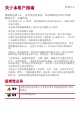• • • • 请勿使用、触摸或试图取下或修复破碎或破裂的玻璃。 由 于滥用或误用造成的玻璃显示屏损坏不在保修范围内。 本手机为正常使用过程中会发热的电子设备。 在缺乏足够 通风的条件下过长时间直接接触皮肤时,可能导致不舒服或 轻微灼伤。 因此,在操作的过程中或之后立即处理您的手 机时,应特别小心。 如果手机变湿,请立即拔下其电源插头,并让它完全晾干。 切勿试图使用烤炉、微波炉或电吹风等外部热源加快干燥处 理。 潮湿手机内的液体会改变手机内产品标签的颜色。 由于接 触液体而对设备造成的损坏不在保修范围内。 有效的手机操作 电子设备 所有手机都可能受到干扰,这种干扰会对性能造成影响。 • 在未经允许的情况下,不得在医疗装置附近使用手机。 不 要将手机放在心脏起搏点上,即胸前的口袋内。 • 手机可能会对某些助听器造成干扰。 • 微弱的干扰可能会影响电视、收音机、个人计算机等。 • 如果可能,请在介于 0℃ 与 40℃ 温度之间使用手机。 将 手机放置在过低或过高的温度的环境下可能会导致损坏、故 障、甚至爆炸。 行车安全 查阅有关在驾驶时使用手机的本地法律法规。 • 不要在驾驶时使用手持式手机。 • 将