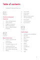 Table of contents 5 Guidelines for safe and efficient use 01 Custom-designed Features 14 14 20 23 24 Video recording features Gallery features Fingerprint recognition Multi-tasking feature Notes on Water Resistant Properties 02 Basic Functions 28 29 32 33 36 37 37 Product components and accessories Parts overview Turning the power on or off Installing the SIM card Inserting the memory card Removing the memory card Battery 39 42 51 54 55 55 61 63 Touch screen Home screen Screen lock Memory card encryp